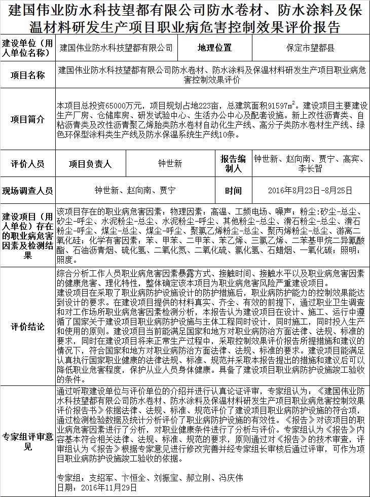建国伟业防水科技望都有限公司防水卷材、防水涂料及保温材料研发生产项目职业病危害控制效果评价